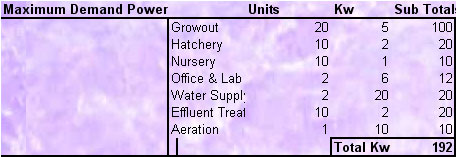 No costing has been made on providing the site power distribution installation; however power installation has been included in the establishment of the Growout, Hatchery and Nursery costings and associated buildings to regulation Australian Standards AS 3000.